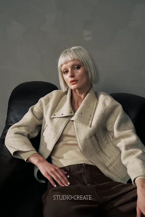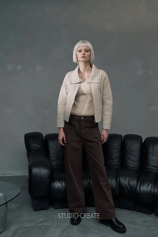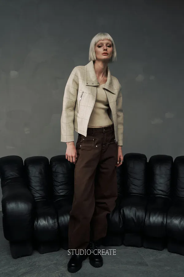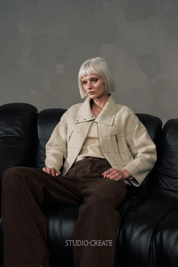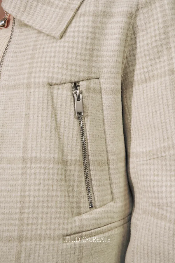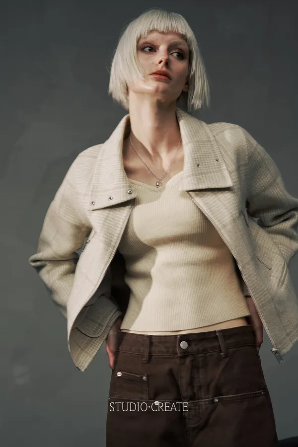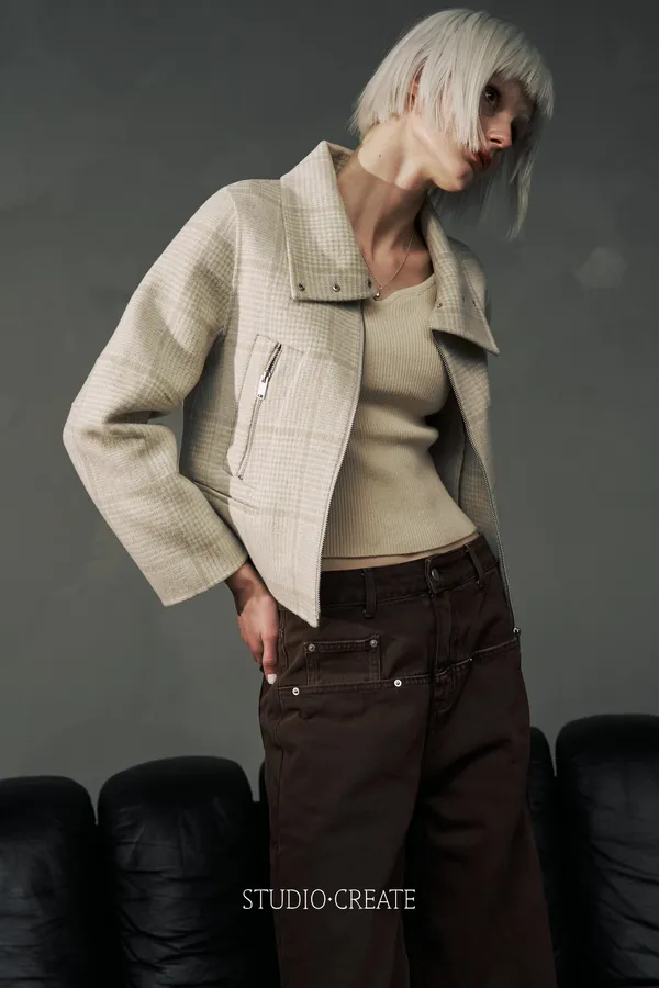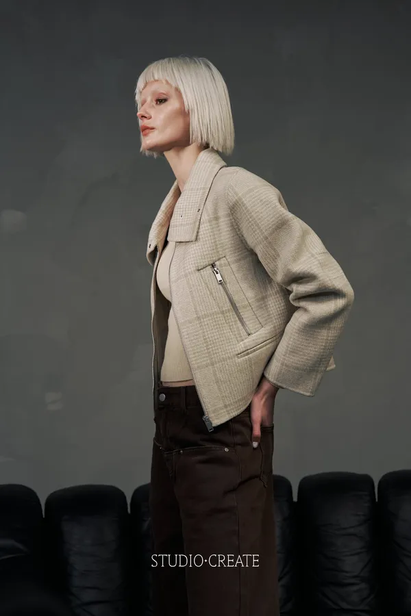 It24 [自訂款在途現貨/售完不一定追加] 質感米白格紋短款改良式騎士風拉鍊短羊毛外套~~❤️