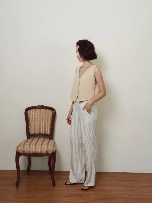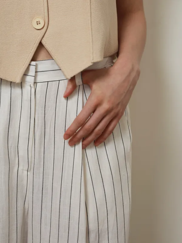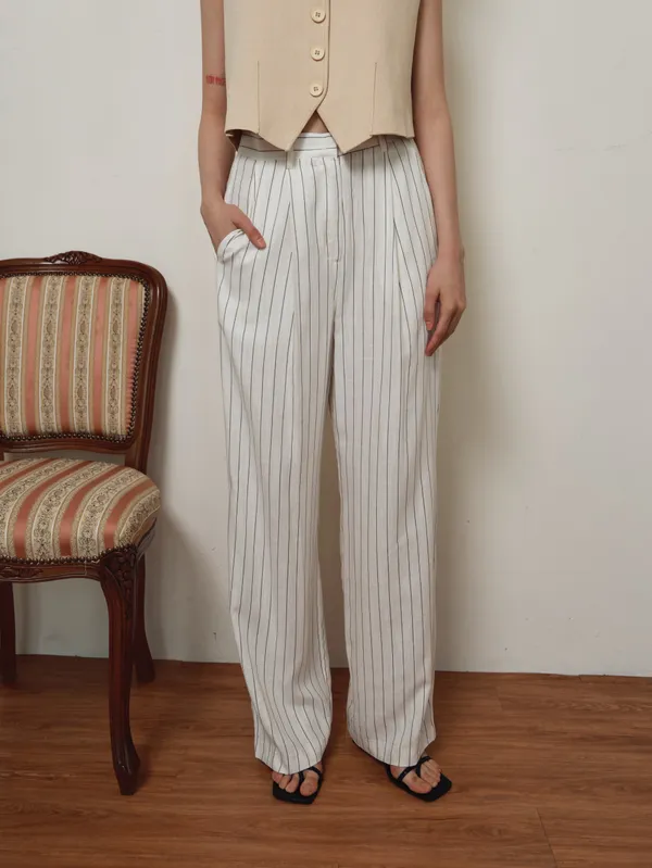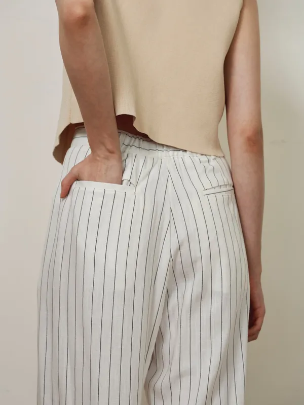 CH30 [斷貨獨家 ] 直條紋老錢風款式 棉麻渡假中直筒褲 超美
