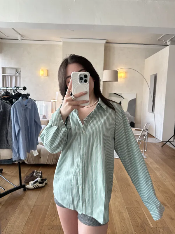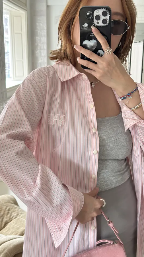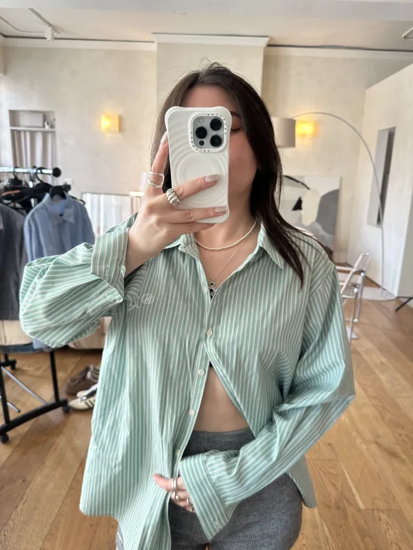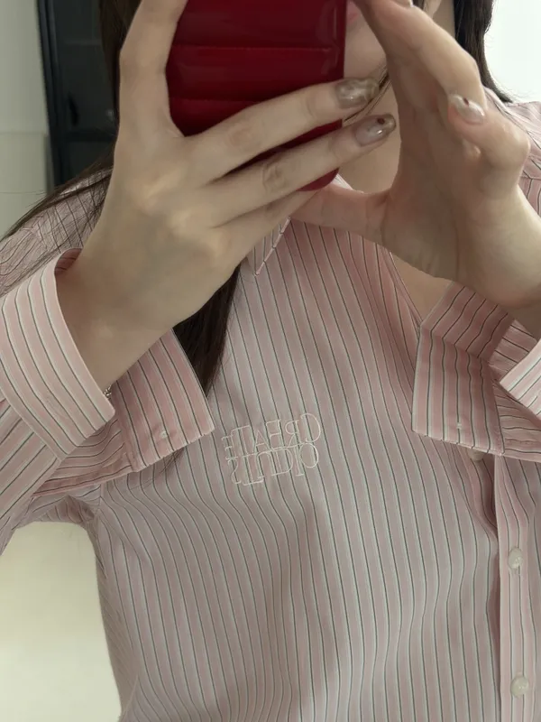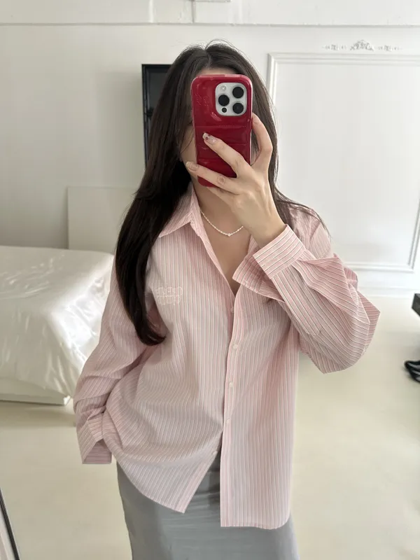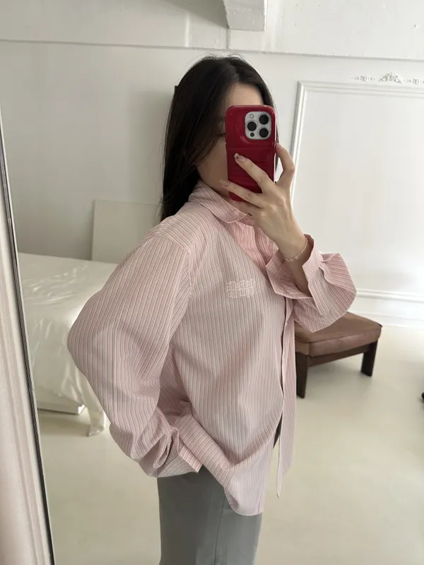 F016 春天好像特別喜歡嫩綠色 ~~miu風刺繡logo線條襯衫~~~必收