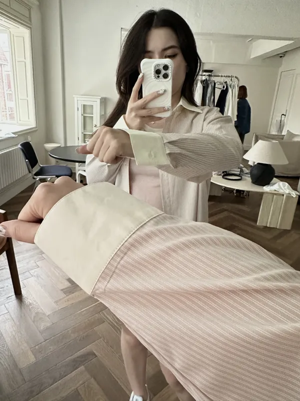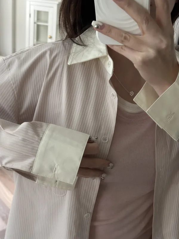 Q041 [獨家自訂款] 日本進口布料抗皺襯衫布料 拼袖粉色襯衫~~超美~❤️